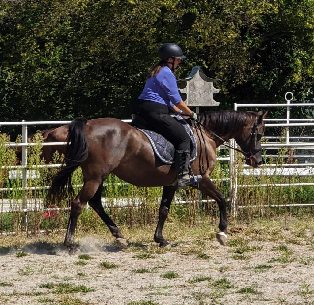 I’m working hard on my position. I’m still tippy, but my legs and hands are getting slightly better. I hope by the time full-blown winter gets here, I’ve fixed more things. That way I can start in the spring feeling more like I can really accomplish something. I hope next year we get balanced enough to attempt the canter. I’ve been terrified of it, given what I’ve seen on the lunge line and long reins. I know it’s different when there’s a rider on board, but still. I certainly hope she will be super balanced next year. I also purchased a cordeo to work on directing her shoulders and hopefully eventually we can go into bridle less riding (not in winter, though, because I’m not insane).