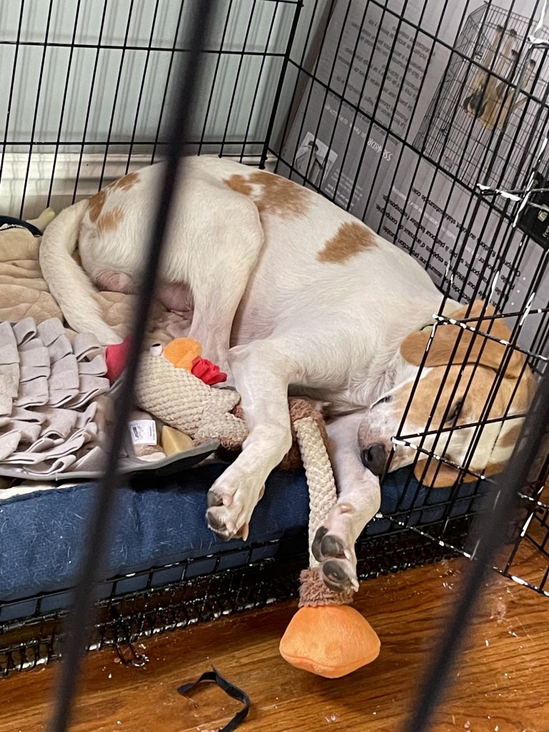 I’m hoping to be able to start again with leaving him alone soon. This morning, I took a shower and left him in the upstairs pen and when I came out, for once he wasn’t up and whining, he was settled in his crate. This is definitely a good sign that he will be able to settle again. I’m trying to get him used to chilling out behind me in the upstairs pen while I work. He had some challenges today, but he eventually settled down and is now passed out on his crinkle chicken.