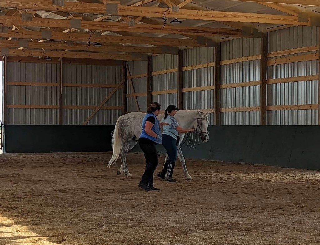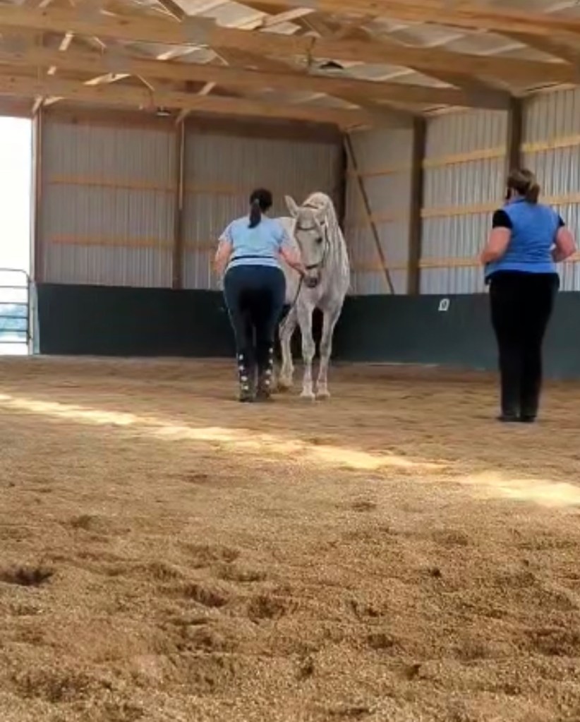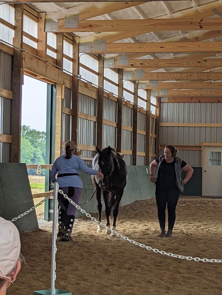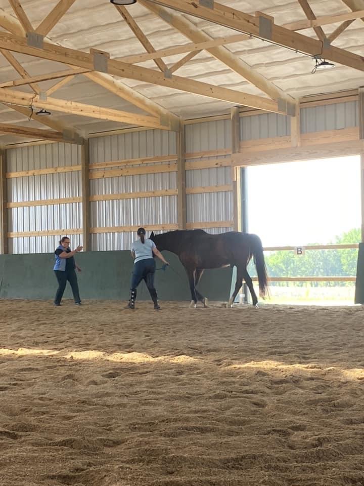 However, that is not the end of the story. I’m thankful that I have such a kind a quick-thinking trainer, who rallied a couple of the participants who knew me and they graciously allowed me to use their horses for a clinic lesson. I was to start working with Dorothy’s horse, Brego, who is a big, gentle bay with an easygoing personality. Next, I worked with the famous, Gustavo, Deanna’s own horse who started her journey with straightness training, through which she found Carolin, who was a straightness training instructor for many years before adding and developing her own methods and techniques. Finally, I was to get to work with Wanda, a dainty Thoroughbred mare owned by my friend, Sam, another student of Deanna’s.