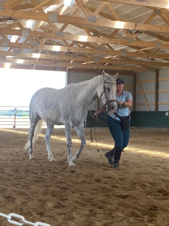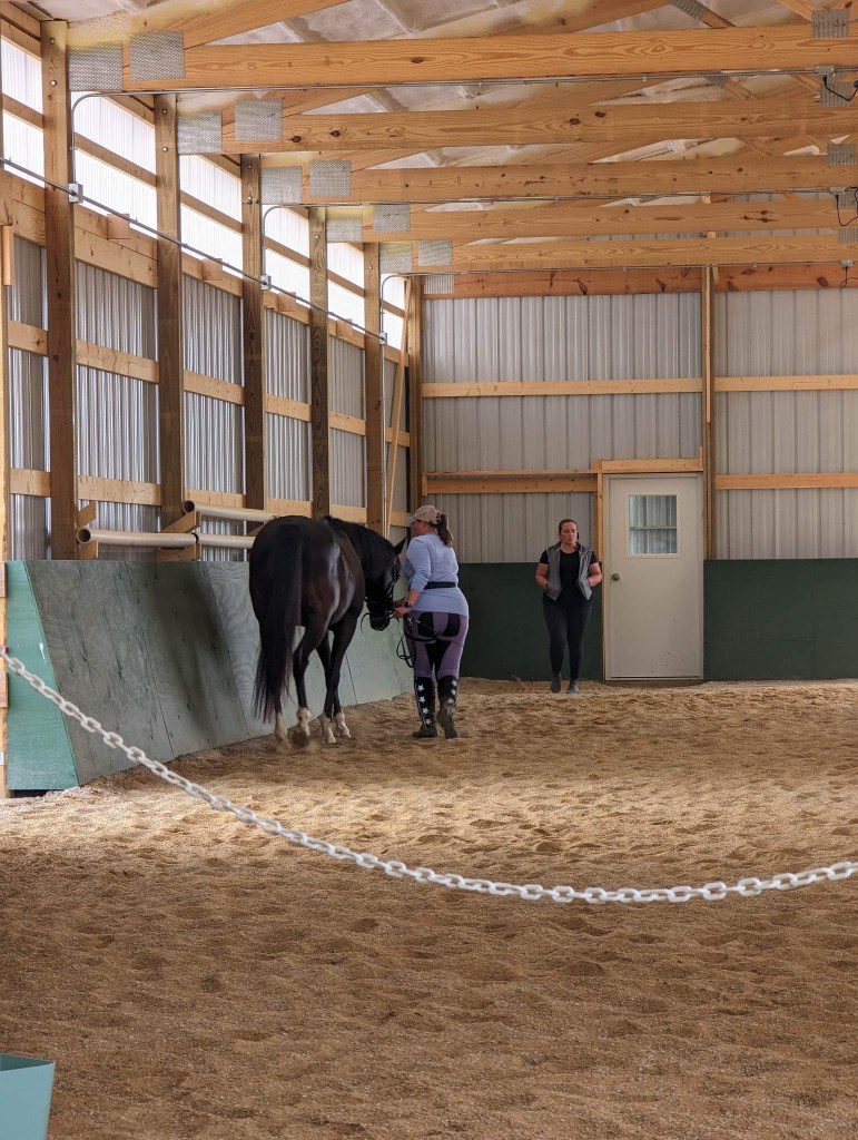 My first session, I got really nervous in the beginning. You know what’s funny? Horses tune into our nervousness, especially when they don’t know us well. Brego picked up on my queues and got a bit pushy and anxious himself. This guy was supposed to be the easy going one! I felt mortified that I’d amped him up like that – in front of a crowd! But as we worked together, I relaxed and things settled down. I did trip over my own feet at one point too, which was totally on brand, and added to my self consciousness, but I kept going. We focused on getting more energy out of him, as he was a more laid-back guy, and I had to calibrate my own strides, trying not to get too far ahead of him as he slowed down and also taking MUCH bigger steps than I was used to when I got him to speed up. By the end of the groundwork session, I was pouring sweat (it was like 90 degrees, to be fair, but much of it was anxiety and concentration). However, once I was done there I was getting the hang of working these techniques with a horse that wasn’t mine.