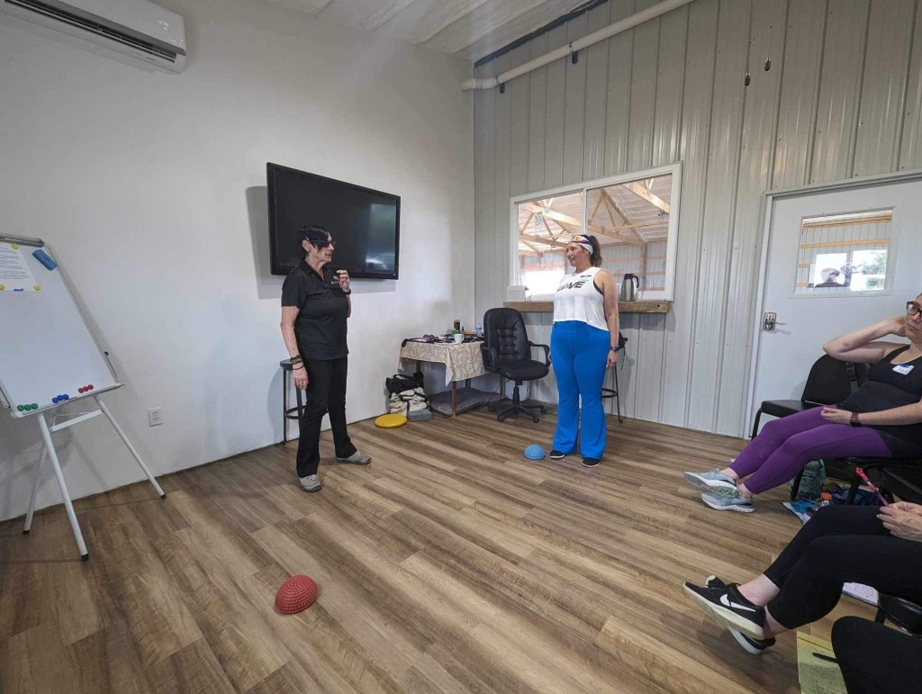 Along with adding lunge lessons and PT exercises, plus the yoga class, I decided to attend Karin Miles’ Neurorider clinic at Shade Tree Stables, hosted by my trainer, Deanna Preis. Using neurological theory and techniques to activate different areas of the brain, Karin is able to help people improve their mobility, strength, balance, perception, and vision; all of which help dramatically to improve people’s riding. She can tell what your issues are just by watching you move and through a series of deductive tests to narrow down the treatment modality. It was amazing to watch other people improve in a matter of seconds!
